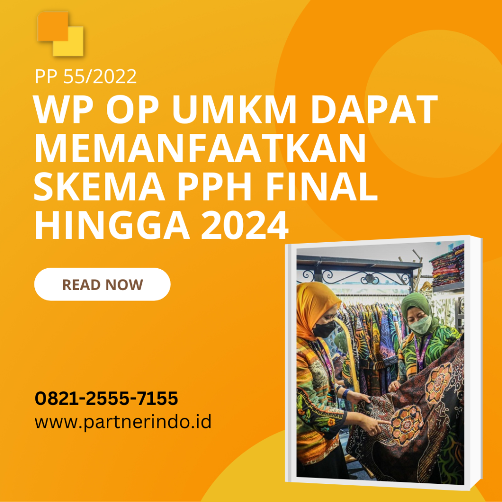 Yogyakarta, PartnerIn – Ketentuan mengenai PPh final UMKM turut dimuat dalam PP 55/2022. Dengan berlakunya peraturan tersebut, PP 23/2018 dicabut dan dinyatakan tidak berlaku. DJP melalui keterangan resminya menyatakan bahwa dengan adanya PP 55/2022, jangka waktu pengenaan PPh final 0,5% terhadap omzet tetap meneruskan ketentuan yang terdapat dalam PP 23/2018. Berdasarkan Pasal 69 PP 55/2022, […]
